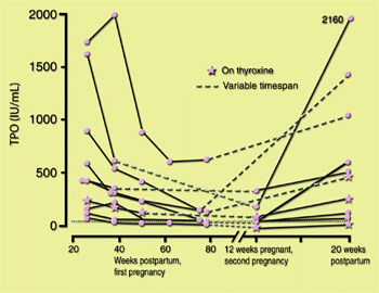 Q: What is the prevalence of PPTD? A: PPTD, defined by biochemical criteria, has a relatively high prevalence of 5 to 9 percent in the year after parturition. The prevalence is much higher in women with existing autoimmune diseases, notably type 1 diabetes mellitus. Q: What is the immediate clinical significance of PPTD to the mother and future offspring? A: Although in the majority of cases PPTD is an autoimmune, benign and self-limiting disorder, at least 25 percent of women with biochemical evidence of hypothyroidism will benefit from thyroid replacement therapy. Higher rates of fertility problems and miscarriage are observed among those who remain untreated, as many of these women have subclinical hypothyroidism and test positive for TPOAb. A growing and disconcerting body of evidence suggests that if the seemingly mild thyroid function abnormalities present in PPTD persist into a subsequent pregnancy, they may be linked to impairment of the intellectual development of the child born from that pregnancy. Q: What is the mother's risk of developing permanent thyroid dysfunction? A: A number of longitudinal studies have reported that the annual rate of progression to permanent hypothyroidism is 2.6 to 11.8 percent (mean: approximately 6.4 percent). This is a very high rate compared to a total incidence rate in adult women of 0.41 percent (i.e. 4.1 cases/1,000 survivors/year) from the data of the Whickham population study.1 Therefore, women with the hypothyroid form of PPTD are at a much greater risk of early progression to permanent hypothyroidism compared to women in the general population. Q: What are the best predictors of a mother's risk of developing permanent thyroid dysfunction? A: In the Whickham population study, there was a gradient of increased probability of hypothyroidism developing within 20 years if the initial TSH was greater than 2.0 mIU/L. This probability is significantly increased if the woman is thyroid autoantibody positive and, conversely, is markedly decreased if the woman is thyroid autoantibody negative. Unfortunately, equivalent long-term data are not available for women with PPTD. Because the modeling done in the Whickham study used women grouped as thyroid autoantibody positive or negative, there are also no available data on the effect of thyroid autoantibody titer on the risk of permanent hypothyroidism. A higher percentage of women, however, develops PPTD if thyroid autoantibody titers are high in the third trimester of pregnancy. In addition, thyroid dysfunction is more likely in the six years after pregnancy if the woman has a high peak TPOAb level in the postpartum period. (See Figure 1.) Applying the Whickham model to PPTD women, we can conclude that a persisting TSH greater than 2.0 mIU/L with positive TPOAb results will markedly increase the risk of developing permanent hypothyroidism over the next 5 to 10 years. There may be key "threshold" concentrations of TSH and/or TPOAb that could jointly predict which women will have the highest risk of becoming hypothyroid within 5 years.