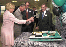 Michael Ziering, CEO and President, DPC, and Marilyn Ziering, Vice President, Marketing Communications, DPC, along with Steve Britton, Managing Director, EURO/DPC, were introduced to Prince Charles and, following a light lunch, they accompanied His Royal Highness on a limited tour of the facility. During the visit, the Prince stopped and spoke to many of the staff. He even made an unscheduled stop into an office with an open door, speaking to three staff members who were taken completely by surprise. The Prince was fascinated by the workings of both the original IMMULITE® and the IMMULITE® 2000 as well as by the contribution DPC's technology is making to healthcare throughout the world. He watched brief instrument demonstrations given by Emma Dunt, EURO/DPC IMMULITE QC, and Lisa Truslove, the UK National Sales Manager. Having walked through the manufacturing facilities, His Royal Highness commented on the high morale and enthusiasm apparent among staff members and management. He also reiterated congratulations on EURO/DPC's 1998 Queen's Award for Export Achievement. The Prince referred to DPC as a pioneer for having installed a high-tech manufacturing and distribution facility in such a rural location. The plant was designed to be environmentally friendly with controlled waste streams, recycling policies and energy-efficient utilities. Now the largest single private sector employer in the area, the Glyn Rhonwy facility is successfully supporting the ongoing needs of the UK, of DPC, Los Angeles and of DPC Instrument Systems Division, New Jersey as sales continue to increase rapidly. His Royal Highness also spoke of EURO/DPC's enlightened approach in taking a proactive role within the local community by encouraging staff to become part-time firemen; lifeboat reservists; and tutors in local schools to help children with difficulties in reading, writing or arithmetic. During the tour, the Prince and Mrs. Ziering cut a special anniversary cake. His Royal Highness was particularly interested in the unusual design of the cake, which depicted the latest DPC "chess piece" marketing initiative. Before leaving the facility, the Prince unveiled a plaque commemorating his visit. He then left the site, having commandeered Mr. Britton's car: the notorious North Wales weather prevented the safe departure of the royal helicopter. All modes of transport have since been returned to their rightful owners! It was an amazing day that left everyone involved with memories to be shared for years to come. |