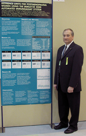 The Education and Management Division (EMD) of the International Federation of Clinical Chemistry and Laboratory Medicine (IFCC) recently invited Leo Vankrieken, Eur. Eng., International Marketing Manager, Reproductive Endocrinology for DPC, to serve as EMD Secretary. The EMD strives to provide IFCC members and the healthcare community with the best education relevant to clinical chemistry and laboratory medicine, directed at scientific, management and clinical issues. Its activities are currently carried out by five committees and one working group. Through his recent appointment Mr. Vankrieken hopes to make more accessible to the healthcare community the valuable information available in a variety of scientific documents and congress proceedings. His commitment to customer education is reflected in his activities at DPC: he has helped to coordinate many clinical studies and has traveled all over the world giving presentations on laboratory diagnostics. One of the IFCC's latest educational forums took place last October in Kyoto, Japan at the 18th International Congress of Clinical Chemistry (ICCC). The event was sponsored in cooperation with the Science Council of Japan (SCJ) and the Japan Society of Clinical Chemistry (JSCC), with the support of the Commemorative Association for the Japan World Exposition (1970). Attendees from 81 countries were present. "Laboratory Diagnostics and the Aging Process," presented by Mr. Vankrieken, was among the industry-sponsored workshops offered during the conference. It provided information on reference range studies using DPC's IMMULITE® systems. These studies document age-related changes in hormone levels, and underscore the importance of determining complete profiles of a variety of hormones in the aging population to arrive at correct clinical diagnoses of hormonal disorders. DPC regularly conducts such reference range studies using the IMMULITE family of automated immunoassay systems. Prize-winning Poster