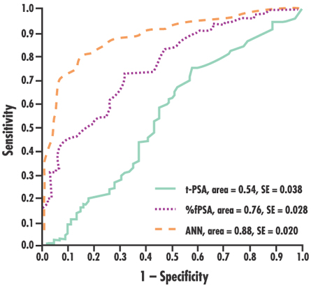 Prostate cancer screening using serum PSA and a digital rectal examination make it possible to detect disease early when treatments are more likely to be successful. However, the conventional PSA threshold value of 4.0 µg/L has been questioned, since 20 to 50 percent of clinically significant organ-confined prostate tumors occur in men with a total serum PSA of less than 4 µg/L.1 Although use of the free-to-total PSA ratio ("PSA index") clearly improves specificity by approximately 15 to 20 percent compared to total PSA alone, its overall specificity is only 20 percent in men with PSA levels of less than 4.0 µg/L. To improve the accuracy of prostate cancer detection, and to exclude unnecessary biopsies in men free of cancer, different logistic regression models and artificial neural networks (ANNs) have been introduced. An ANN is an information-processing paradigm that organizes information in much the same way as the mammalian brain. ANNs have been shown to predict the outcome of prostate biopsy in individual patients better than traditional statistics and can handle a greater number of variables with nonlinear relations than logistic regression. Dr. Carsten Stephan, from the Department of Urology, University Hospital Charité, Humboldt University, Berlin, Germany, tested an ANN in an attempt to improve the accuracy of prostate cancer detection. Input variables included the ratio of free PSA and total PSA values, patient age, prostate volume and digital rectal examination findings (Figure 1). For the training and validation of this ANN (called "ProstaClass"), six institutions in Germany, The Netherlands and Canada contributed data on nearly 1,200 patients with biopsy-proven prostate cancer or benign findings. Results of this study, published last year in Clinical Chemistry, showed ProstaClass to be significantly more sensitive than either total PSA or percent free PSA in clinical practice (p < 0.01).2 Overall, Dr. Stephan was able to improve the sensitivity to detect prostate cancer by 20 to 22 percent over that obtained with the free-to-total PSA ratio alone. Most importantly, in men with low PSA levels (between 2.0 and 4.0 µg/L), the ANN detected 72 percent and 65 percent of cancers with specificities of 90 percent and 95 percent, respectively. Figure 2 depicts a ROC curve comparing total PSA, free-to-total PSA ratio and ProstaClass for patients with a PSA value in the 4.1 to 10 µg/L range, and clearly shows superior sensitivity for ProstaClass. Since only DPC assays were used to train and validate ProstaClass, the sensitivity of this ANN could well be significantly lower if other manufacturers' PSA assays are used.