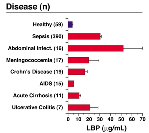 Ph.D. DPC and XOMA, a California-based biopharmaceutical company, recently concluded an agreement for the development and marketing of an assay for lipopolysaccharide binding protein (LBP) on DPC’s patented IMMULITE® platform. The test was developed with XOMA’s patented technology that uses LBP as a biochemical marker for systemic exposure to bacteria and endotoxin. DPC has just introduced IMMULITE LBP outside the US. Reproduced here is a discussion of LBP from XOMA’s Web sitewww.xoma.com. LBP (lipopolysaccharide binding protein) may be a useful marker for diagnosis and prognosis of patients with infectious complications caused by exposure to bacteria and endotoxins. Serious and sometimes-fatal complications such as pneumonia, respiratory distress, and blood infections frequently follow infections, surgery or trauma, and affect more than a million patients worldwide every year. XOMA scientists have developed a rapid and accurate diagnostic assay for LBP as part of a comprehensive approach to treating this large category of diseases. Such a test may also contribute to improved clinical trial design in difficult diseases and syndromes like sepsis. XOMA has measured LBP levels in plasma samples from healthy adults and more than 700 patients suffering from 20 different diseases. Elevated LBP levels were seen in patients with conditions involving exposure to bacterial endotoxins, such as meningococcemia, presumed gram-negative sepsis, complicated abdominal infections, and inflammatory bowel disease. (See Figure 1.) Elevated LBP levels have been correlated with poor outcome in sepsis patients. These results prompted XOMA investigators to monitor plasma LBP levels in patients enrolled in several NEUPREX®* studies. Data from meningococcemia and abdominal infection patients shows increased LBP levels in both populations. XOMA has licensed its LBP assay technology to DPC to produce an assay on the IMMULITE automated chemiluminescent EIA platform, to aid in accurate diagnosis and prognosis of patients at risk for infectious complications. Endotoxins and