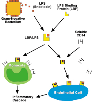 the Systemic Inflammatory Response Gram-negative bacteria and their endotoxins are a causal or complicating factor in many diseases. Invasive systemic infections caused by these organisms (bacteremias) are a well-known source of exposure. Secondary endotoxin exposure may complicate the course of various diseases as well as trauma or surgery. Sometimes an exogenous source of gram-negative infection is identified; in other cases, complications may result from translocation of endogenous gram-negative organisms and endotoxins from the patient’s gastrointestinal tract. Whatever the source, exposure to endotoxin can induce a systemic inflammatory response that involves many interconnected cellular and plasma mediators. This can manifest in clinical signs such as fever, increased heart and breathing rates and other symptoms. The response may be self-limiting, or it may proceed to shock, organ failure and death. Current treatments are limited to antibiotics and supportive intensive care. Advancements in efforts to prevent or treat this systemic inflammatory response syndrome (SIRS) have been hampered by several factors. The lack of a consistent and rapid diagnostic for endotoxin exposure is one. A variety of cytokines and serum proteins have been advanced as candidates for the diagnosis of infections, SIRS and other endotoxin-related conditions, as yet without success. Because of its critical position early in the inflammatory process, lipopolysaccharide binding protein (LBP) may be an ideal target for developing a diagnostic and prognostic product. For more information on DPC’s IMMULITE LBP assay, please contact your National Distributor or Gail Mastright at DPC Corporate Marketing in Los Angeles. * NEUPREX is XOMA’s experimental drug for the treatment of meningococcemia.
