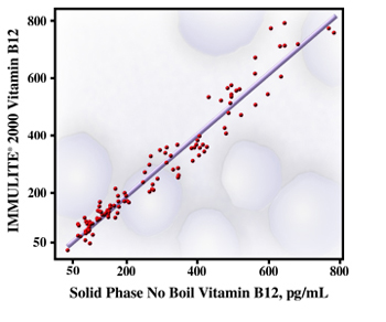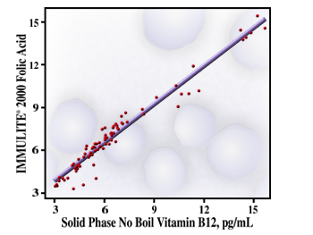 anemia testing Automating the sample pretreatment is not only convenient; it also allows for uniform sample handling for enhanced precision. In addition, the assays were designed to provide reliable results and overcome the difficulties encountered by some manufacturers’ tests when assaying certain sample types such as those from renal dialysis patients.9 9. Roberts WL, Schwartz EL, Moulton L. Performance characteristics of the IMMULITE 2000 serum folic acid assay [abstract]. Clin Chem 2000;46(6 Suppl):A110-1. IMMULITE 2000 Vitamin B12 and Folic Acid compare well with DPC’s Solid Phase No Boil assayslong-time industry standards. (The figures display correlation data.) Calibration ranges are wide enough to accommodate reference values and those found in a broad array of clinical conditions. For patients receiving supplemental therapy, particularly those receiving folate whose results may exceed the reportable range, the system is capable of automatic sample dilutions. Precision for Vitamin B12, expressed in terms of CVs, ranges from 5 to 14% over the calibration range; that for Folic Acid is excellent, ranging from 5 to 9%. Linearity is good for both assays. Whereas some manufacturers’ folic acid assays lose linearity with increasing concentrations,10 10. Billen J, Zaman Z, Claeys G, Blanckaert N. Limited dynamic range of a new assay for serum folate [letter]. Clin Chem 1999;45:581-2. Manzella S, Gronowski A, Ladenson J, Scott MG. Limited linear range of the Abbott AxSYM serum and erythrocyte folate methods [letter]. Clin Chem 1999;45:582-3. the IMMULITE 2000 assay demonstrates uniform linearity across its calibration range, for reliable results at the high end of the calibration range. The system advantage