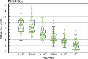 DHEA-SO4 declined from 9.2 (21 - 30 y) to 2.4 µmol/L (> 70 y) and median