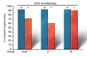 ulcer disease: a much higher percentage of patients with ulcers were CagA