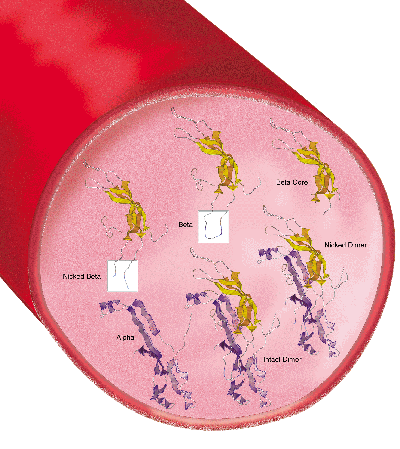 | Figure 1. Among the several HCG forms that appear in the blood are free alpha subunit, free beta subunit, nicked free beta (with cleavage sites--between amino acids 47 and 48, 43 and 44, or 44 and 45--in blue), intact dimer, nicked dimer (includes nicked beta subunit), and beta-core fragment (amino acids 6 ‚ 40 and 55 ‚ 92). |