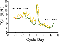 a plot for FSH, estradiol, and progesterone focusing on the luteal-follicular